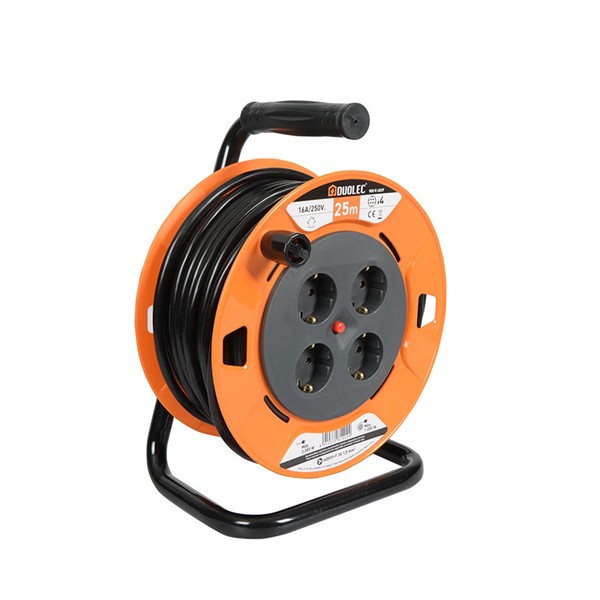 4 tomas T/T lateral. Cable H05VV-F 3G1.5. Interruptor de protección térmica. Potencia máxima admisible cable desenrollado 3.000 W. Cable enrollado 1.000 W. Tensión 16A/250V. Protección infantil. Tirador extensible. Placa para fijar el carrete durante el transporte. IP20. 25 m.
