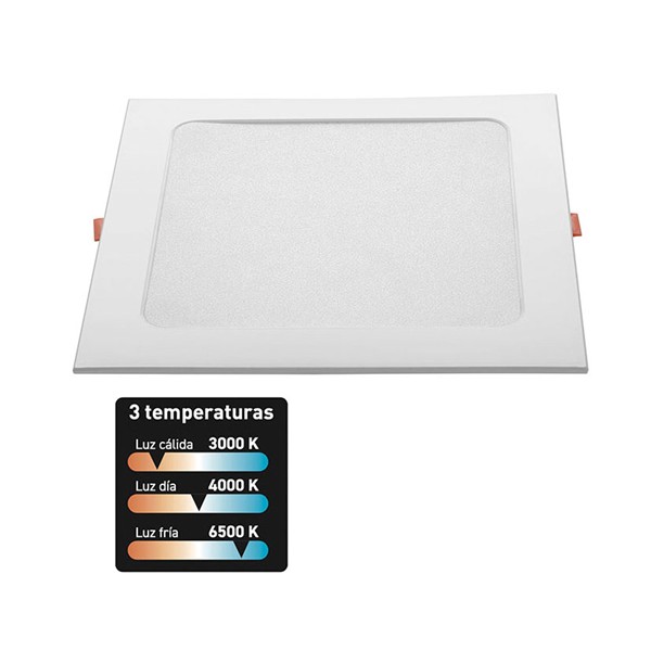 Cuerpo plástico. 18 W. 1260 lm. 3 temperaturas de color: 3000-4000-6000K. Cuadrado. Empotrable. 21x21x2,8 cm.