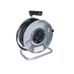 Tambor metálico 4 tomas TT lateral. Cable H05VV-F 3G1,5. Interruptor de protección térmica. Potencia máxima admisible cable desenrollado 3.500 W. Cable enrollado 1.000 W. Tensión A./250 V. Homologación CE. Protección IP220. 50 m