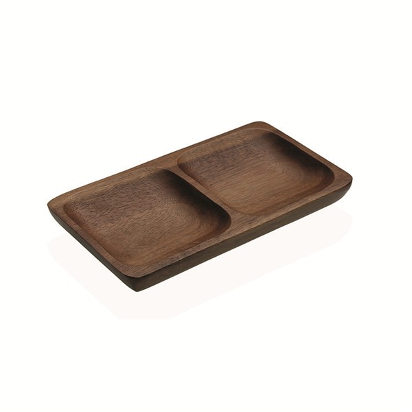Fuente rectangular 2 compartimentos en madera de acacia. 17,5x10x2cm.