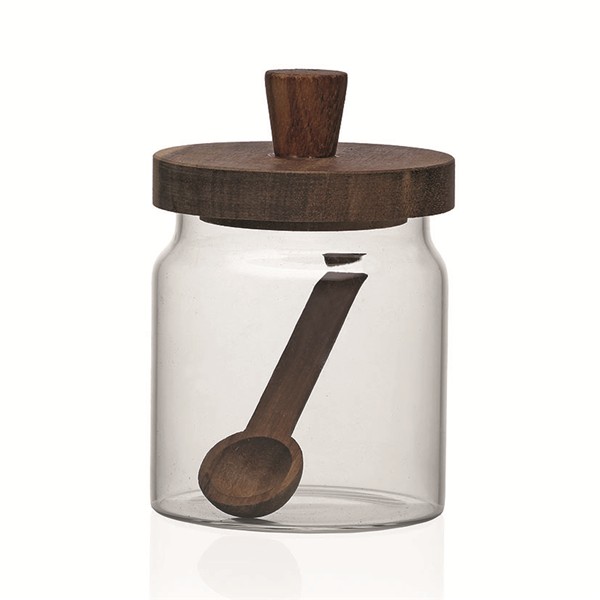 Bote en cristal borosilicato y tapa y cuchara en madera de acacia. Capacidad 470ml.