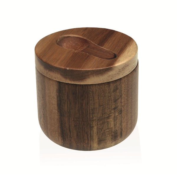 Bote con tapa en madera de acacia. Incluye cucharilla en acacia. 10x10x9,6cm.