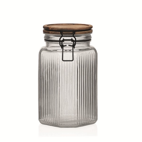 Bote cristal hermético acabado rayas con tapa en madera acacia. 1500 ml.
