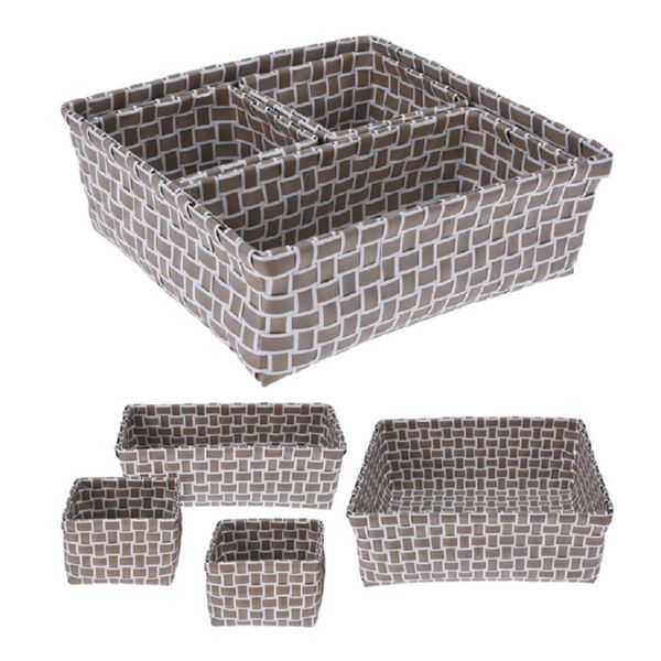 4 piezas combinables. Polipropileno trenzado sobre armazón metálico. 3 colores surtidos: gris, negro y marrón. 28x28xh.10 cm. 26x13xh.9 cm. 2 cajas 13x13xh.9 cm.