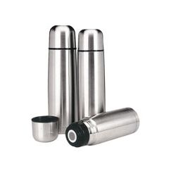 Acero inoxidable. Doble pared, cámara de vacío. Tapón con pulsador dosificador. Irrompible. 1 l.