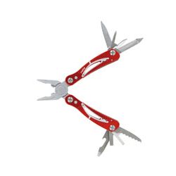 Cuerpo de acero inox 420. Fácil acceso a las herramientas. Incluye funda de nylon adaptable a cinturón. 10 funciones. Medida abierto: 110 mm y cerrado: 72 mm. Alicate universal, Cortador de alambre, Cuchillo dentado de 3 cm., Abrelatas/abrebotellas, Minicuchillo, Destornillador phillips, Destornillador plano 3 mm., Destornillador plano 4 mm., Lima doble cara 3,5 cm., Navaja punta 3,5 cm.