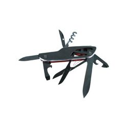 7 funciones. Cuerpo aluminio anodizado. Accesorios acero inox 420. Funda nilón adaptable al cinturón. Medida cerrada: 100 mm. Hoja navaja 58 mm. Hoja navaja 35 mm. Sacacorchos Punzón/ ojo hilvanar Abrelatas/destornillador pequeño Abrebotellas/destornillador grande Tijeras multiusos