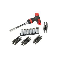 Carraca reversible. Mango ergonómico antideslizante bimaterial. Vasos acero cromo-vanadio. Puntas acero S2. 31 puntas. Plana: 3-4-5-5-6-6-6-7 mm., Phillips: Nº0-1-1-2-2-2-3-3, Torx: T10-15-20-25-27-30-40 mm., Stecker hexágono: 2-3-4-5 mm., Pozidriv: PZ0-1-2-3, 6 vasos: 6-7-8-9-10-11 mm., 1 adaptador vasos, 1 portapuntas magnético 6x90 mm., 1 mango tipo T.