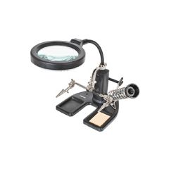 Profesional. Brazo articulado y lente con 16 LED. 2 pinzas cocodrilo para sujeción. Soporte con disipador para soldador lápiz. Soporte para rollos estaño y guía para hilo de estaño. Alimentación: 4 pilas AA (no incluidas) y adaptador 220/240 V. Lente acrílica Ø 100 mm. Aumentos: x2. Dioptria x4.