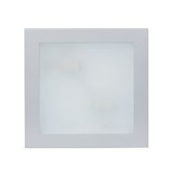 Bisel acero pintado epoxi plata mate. Cristal templado plano serigrafiado 4 mm. IP20, clase I. Rosca E27. Bombillas bajo consumo, Eco-Halógenas o LED ( no incluidas) Cuadrado 30x30 cm. 2 bombillas