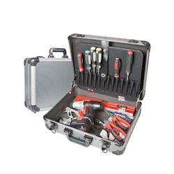 Perfil de aluminio con esquinas metálicas reforzadas. Paneles exteriores PVC ligero con interior acolchado. Bandeja interior portaherramientas (doble cara). Cierres metálicos con llave. (Herramientas no incluidas). 45x33x14 cm.