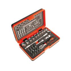 Carraca reversible 1/4 expulsador Locksystem. Vasos perfil MultiPlus para usar sobre tuercas y tornillos hexagonales (métrico/pulgadas), poligonales y con perfil E-TX. Presentado en estuche plástico bimaterial Composición: 1 Llave carraca 1/4 x 60 dientes. 1 Prolongador 50 mm. 1 Prolongador flexible 150 mm. 1 Cardan universal. 1 Adaptador de puntas. 11 Vasos MultiPlus: 4-5-6-7-8-9-10-11-12-13-14 mm.