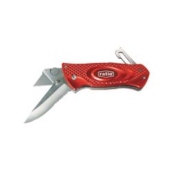 Cuerpo de aluminio anodizado. Cuchillo plegable 75 mm. con hoja dentada. Hoja trapezoidal retráctil de cambio rápido. Clip para cinturón. Incluye recambio. CORTADOR/CUCHILLO TURBO RATIO