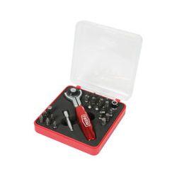 Carraca 1/4 reversible con cabezal pivotante 270º. Mango multiposición ajustable (0º -30º -50º -70º -90º) de aluminio anodizado. Presentado en estuche plástico. 1 llave carraca 1/4 de 72 T. 1 prolongador 50 mm 1 adaptador de puntas 21 puntas acero S2: PH 1-2-3 T 10-15-20-225-27-30-35-40 1,5-2-2,5-3-4-5-6-7 mm. PZ 2-3