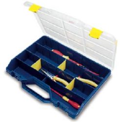 Caja portatornillos modulable.Incluye divisiones que permiten distribuir los compartimentos.Tapa reforzada.Contiene 21 separadores.Medidas: 460 x 350 x 81 mm.