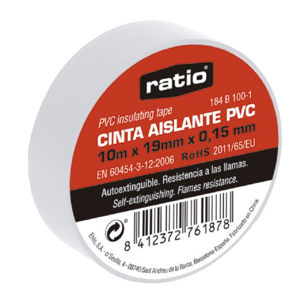 Ancho de cinta 19 mm. Espesor 0,15 mm. Autoextinguible. Resistencia a las llamas. Normativa EN 60454-3-12:2006. Directiva RoHs 20011/65EU. 10 m. Blanco