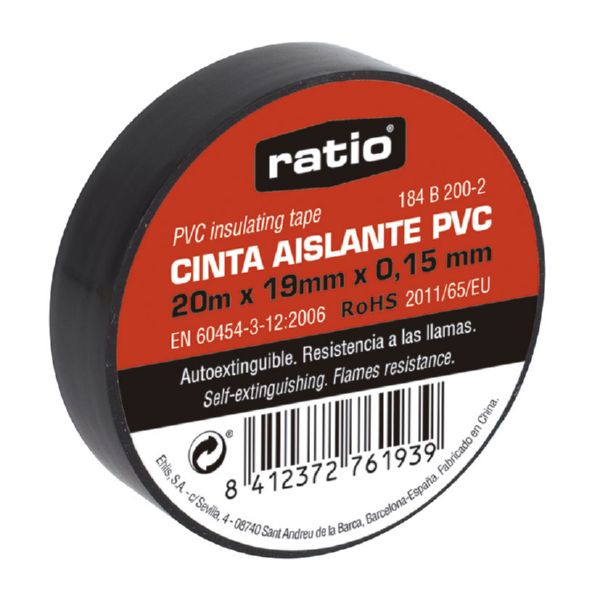 Ancho de cinta 19 mm. Espesor 0,15 mm. Autoextinguible. Resistencia a las llamas. Normativa EN 60454-3-12:2006. Directiva RoHs 20011/65EU. 20 m. Negro