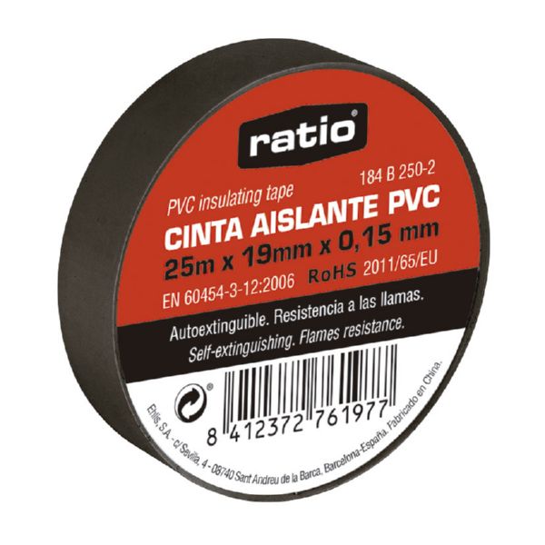 Ancho de cinta 19 mm. Espesor 0,15 mm. Autoextinguible. Resistencia a las llamas. Normativa EN 60454-3-12:2006. Directiva RoHs 20011/65EU. 25 m. Negro