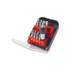Acero cromo-vanadio. DIN 3126. 59 - 61 HRC. Estuche con clip para cinturón. Caja expositor display 12 unidades. 18 puntas 25mm: 4 Planas 4-5-6-7 mm. 3 Phillips Nº 1-2-3 3 Allen 4-5-6 mm. 3 Pozidriv Nº 1-2-3 4 Torx T10-15-20-25 1 Adaptador magnético