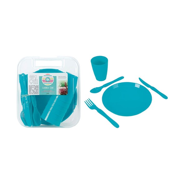 PP. 31 piezas. 6 platos, 6 vasos, 6 cucharas, 6 tenedores, 6 cuchillos y1 estuche. 3 colores. 6 platos ø 21 cm. 6 vasos ø 7,5xh.9,5 cm capacidad 300 ml. 6 cucharas 18,5 cm. 6 tenedores 18,5 cm. 6 cuchillos 18,5 cm. 1 Caja transparente 24x24xh.11 cm.