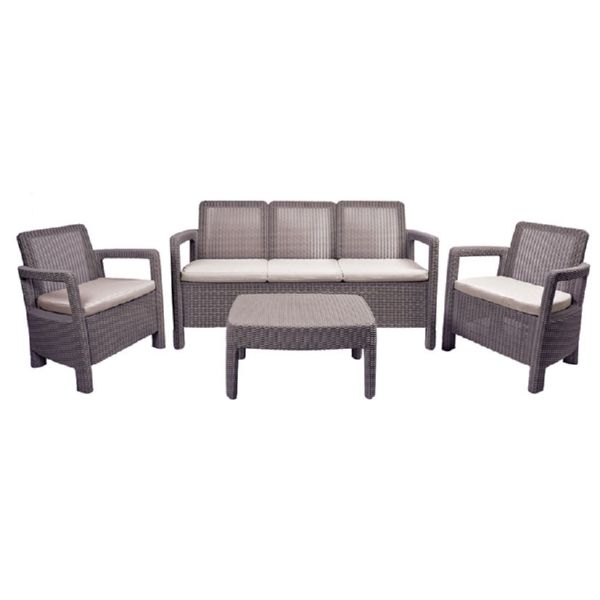 Ratán redondo abierto. Color antracita. Conjunto sofá 3 plazas 180x60xh.79 cm y 2 sillones 71x69xh.79 cm, mesa auxiliar 77x55xh.40 cm. Cojines incluidos.