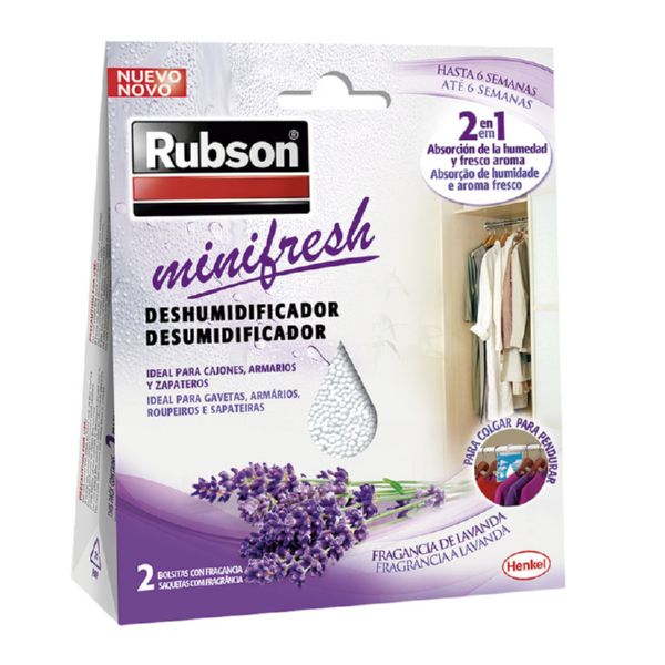 Deshumidifica y perfuma. Perlas higroscópicas que absorben el exceso de humedad transformándola en gel. Ideal para cajones, armarios y zapateros. Para espacios de 1-2 m2. Duración hasta 6 semanas. 2 bolsitas. Aroma lavanda.