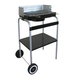 Chapa metálica. Parrilla cromada 2 asas. Ruedas de transporte. Cenicero desmontable. Brasero 35x50 cm. Altura parrilla: h89 cm.