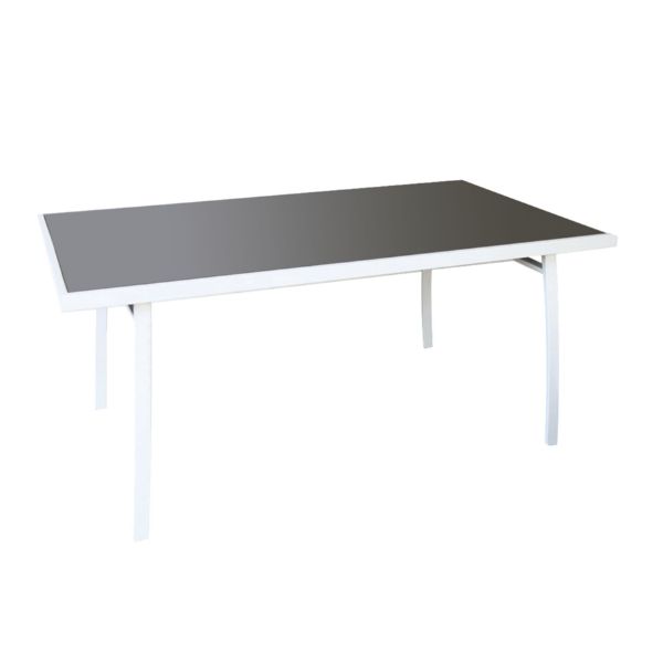 Estructura de acero blanco. Mesa con superficie de cristal templado. Sillas con respaldo de textilene gris. Mesa de cristal templado. 160x90xh.72 cm.