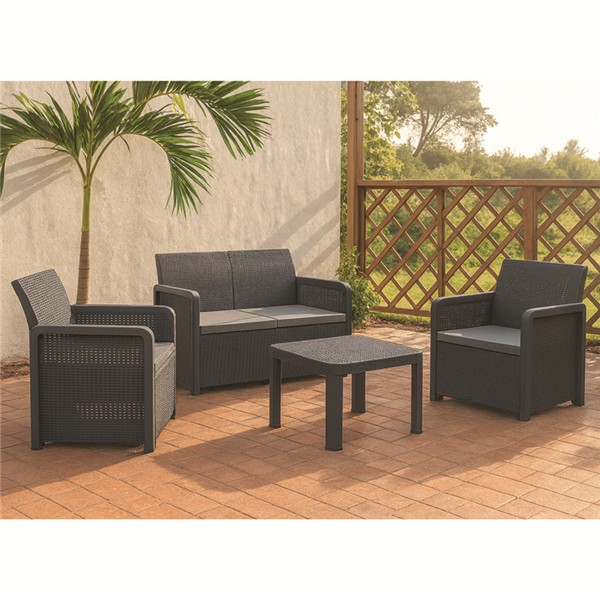 Estructura ratán sintético. 4 piezas. 2 sillones individuales. 1 sofá doble. 1 mesa central. Incluye cojines. Sillones: 56x60xh. 74 cm. Sofá: 109x60xh. 74 cm. Mesa: 57x57xh.42 cm.